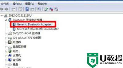 7、在设备管理器里找到蓝牙设备,正常驱动的话应该如下图这个状态,若有异常,蓝牙设备前面会有一个黄色的感叹号出现!当然你也可右键单击你的蓝牙设备,更新一下你的蓝牙驱动。